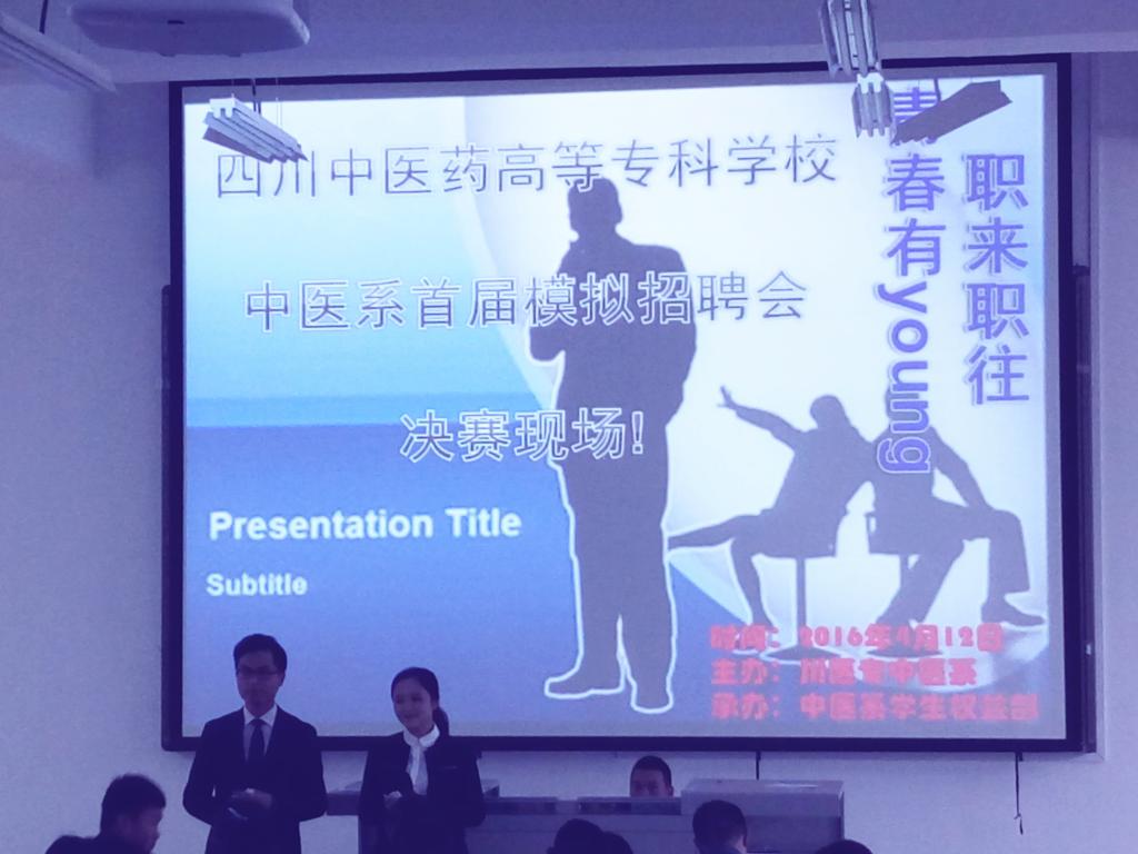 2016年4月12日18:00,由中医系团学会学生权益部主办的以“职来职往,青春有young”为主题的模拟招聘会决赛在教学楼3-2-3隆重举行。本次活动邀请到了中医系团总支书记周莉老师及三位学生代表担任大赛评委,中医系百余名学生参加了此次活动。
