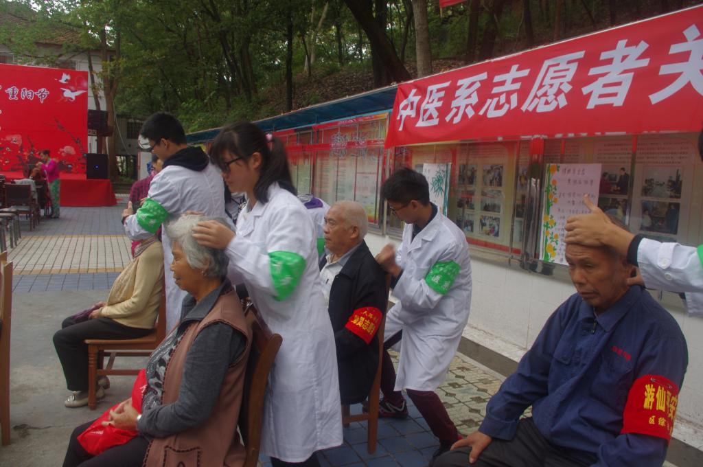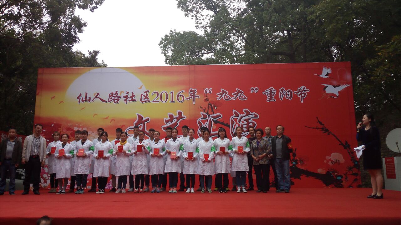 金风飘菊蕊,玉露泣萸枝,又是一年重阳时。为弘扬中华民族敬老爱老的优秀品德,响应党政工作关爱老人的政策,传承中医文化,2016年10月9日,我校中医系师生志愿者在中医系党支部的带领下,在仙人路社区开展了以“九九重阳情,浓浓敬老心”为主题的敬老志愿者活动。为老人们带去了诚挚的节日祝福与关爱。