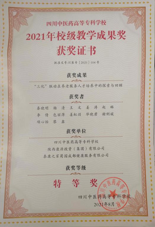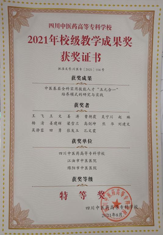 近期,中医学院在学校教学成果奖申报中,党委书记秦晓明牵头项目“‘三化’联动在养老服务人才培养中的探索与回顾”、校长王飞牵头项目“基层全科实用技能人才‘五元合一’培养模式的研究与实践”均获四川中医药高等专科学校2021年校级教学成果奖特等奖。