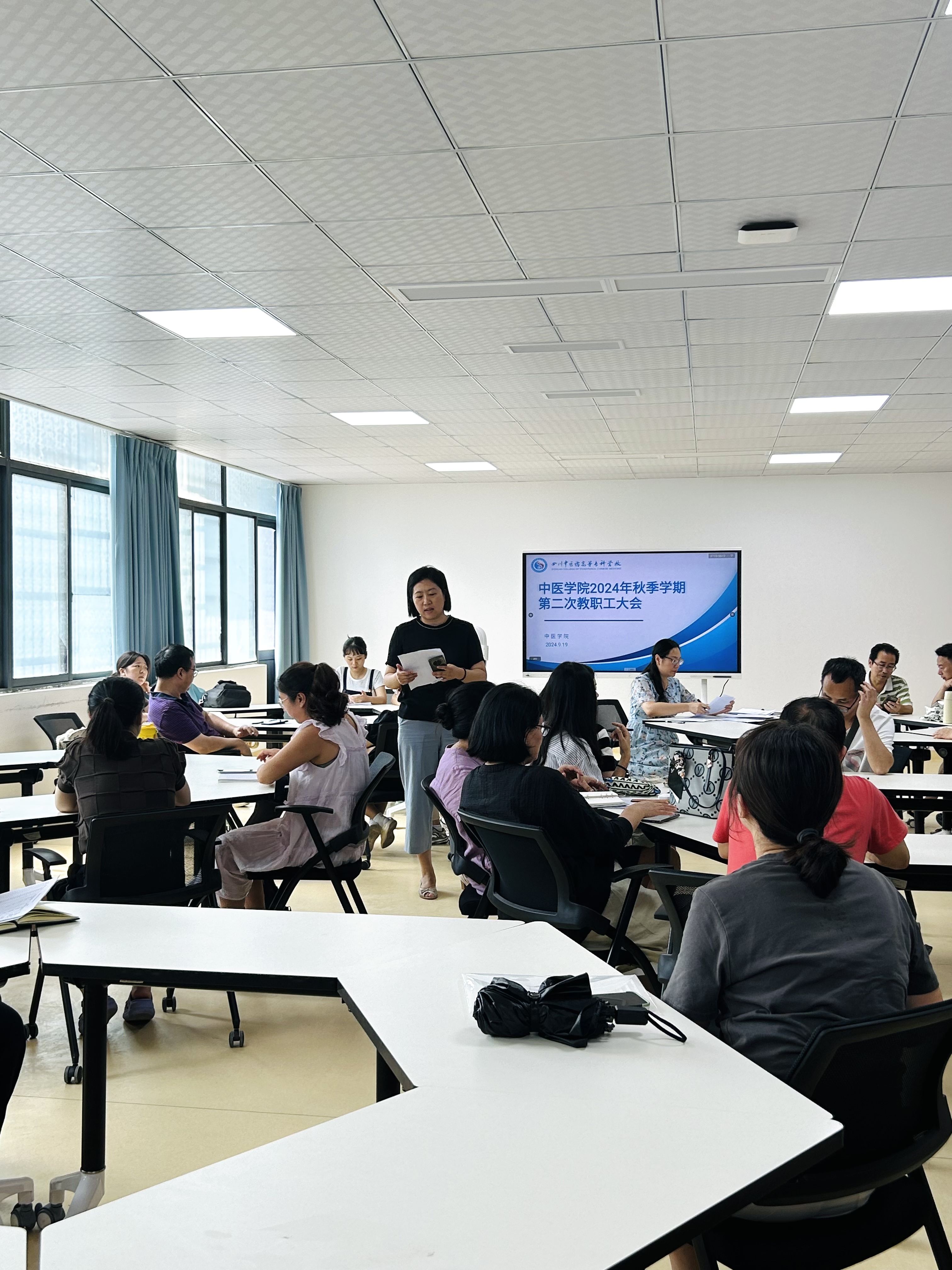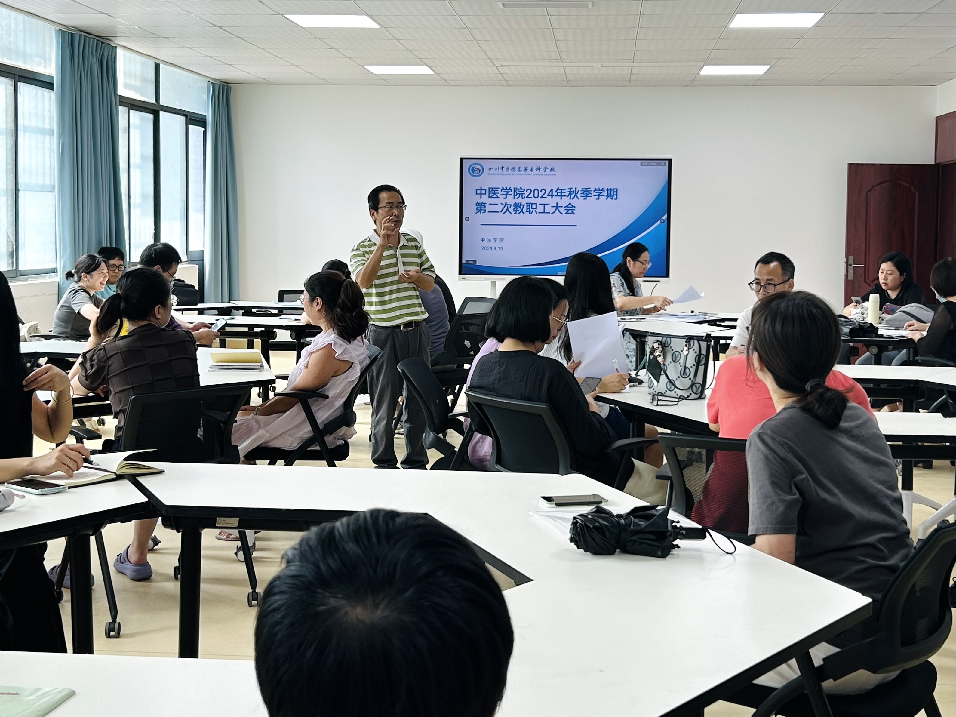 中医学院2024年秋季学期第二次教职工大会于9月19日在附子楼三楼实训室举行,会议由王文院长主持。此次大会中医学院全体教职工参会,旨在强调我院的升本工作要求,并对下一步升本工作提出安排。