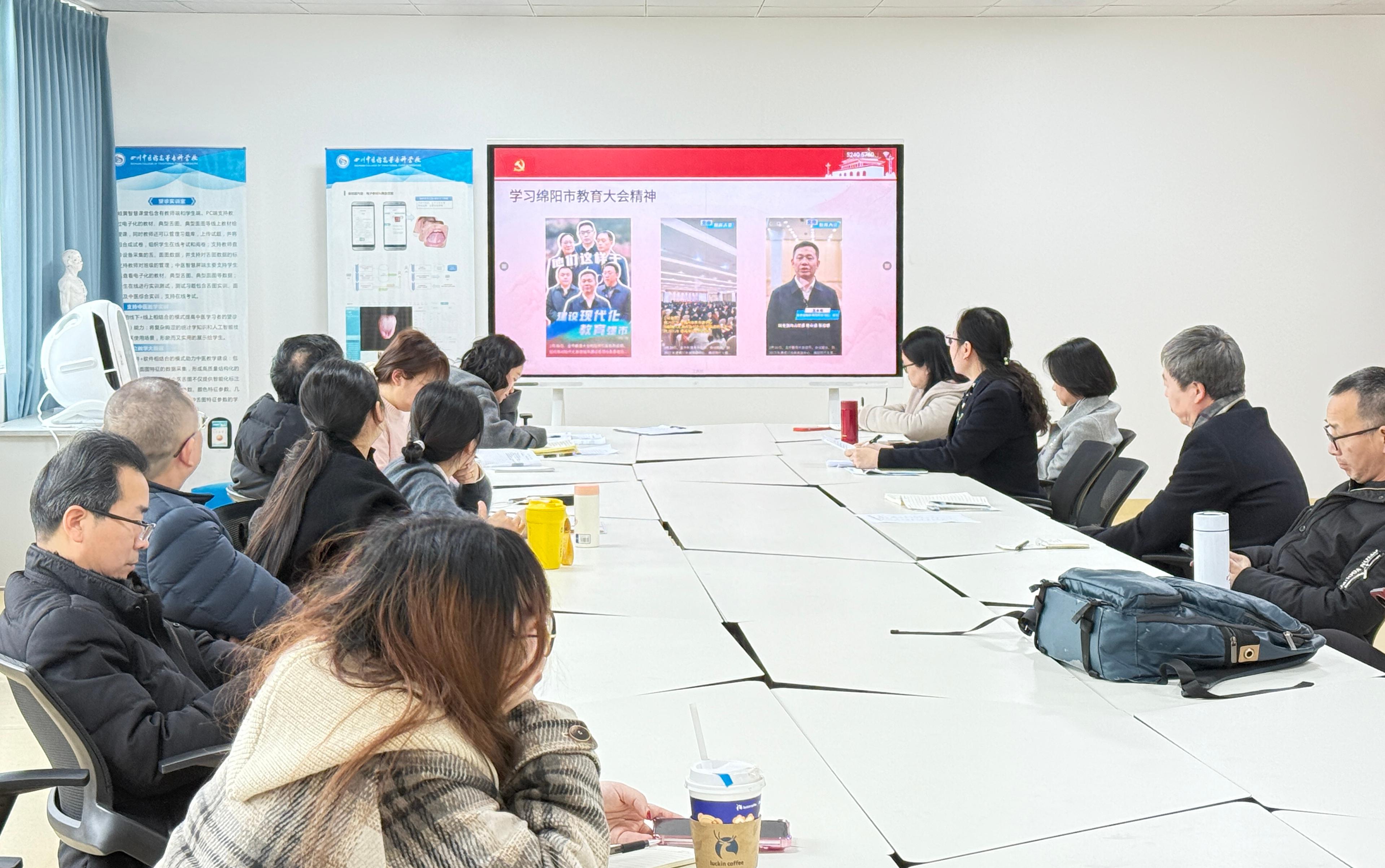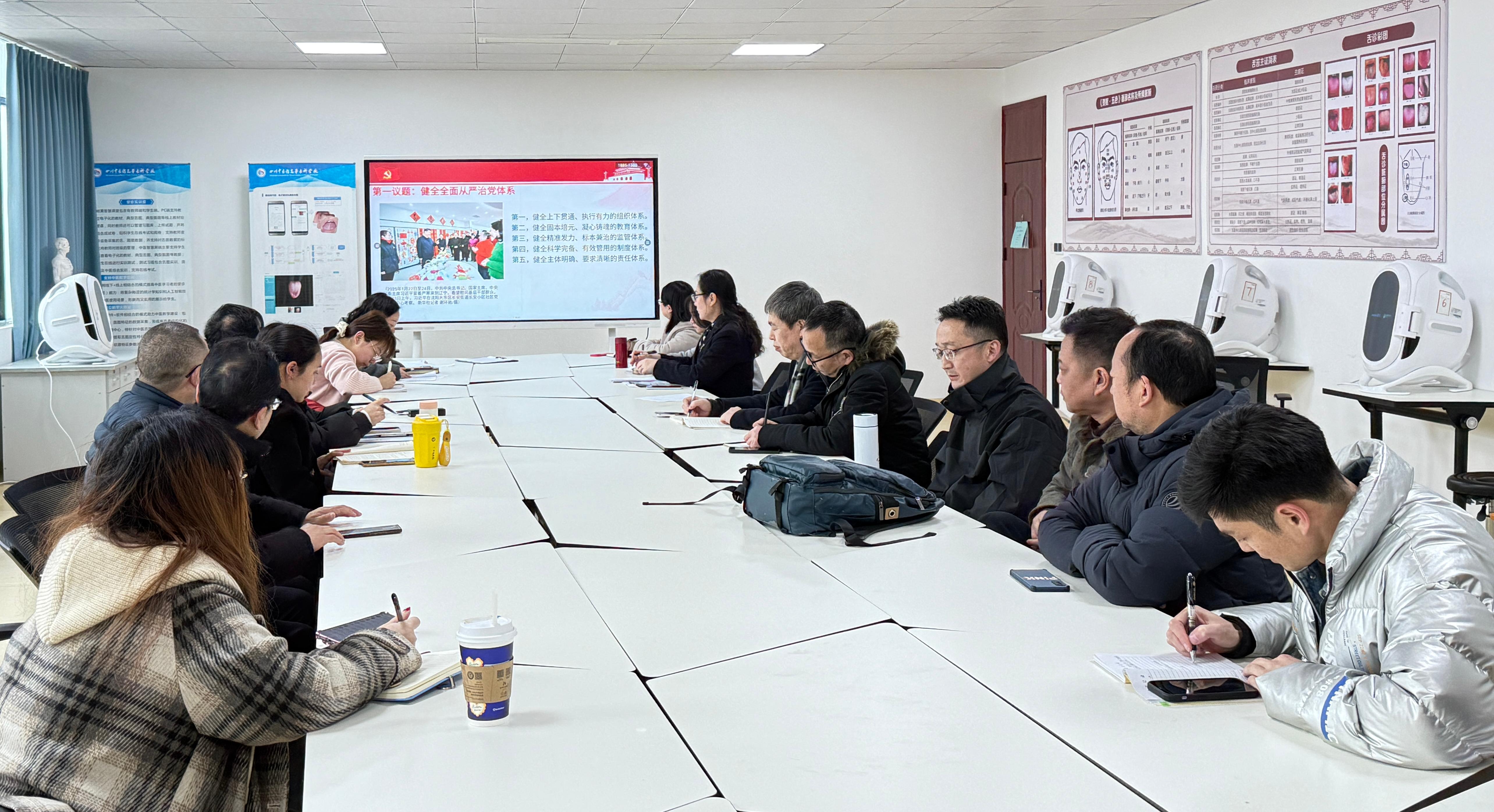 2025年2月27日,中医学院党总支在附子楼智慧教室举办了“科研引领 创新驱动 团队建设”主题党日活动,由党总支书记姜涛主持,旨在深入学习贯彻习近平新时代中国特色社会主义思想、《教育强国建设规划纲要(2024—2035年)》和省市教育大会精神,推动学校升级升本转型成功,促进中医学院高质量发展。