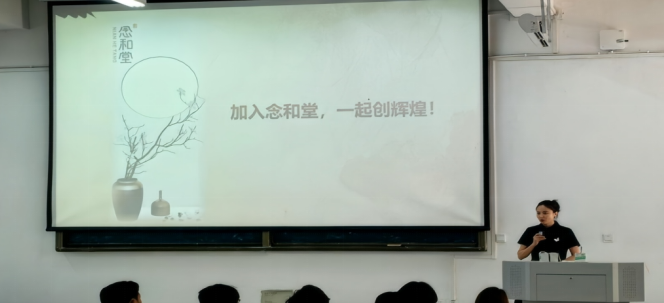 宣讲会上,中医师刘老师率先登场,围绕念和堂的发展脉络、核心业务及企业优势展开详细介绍。他提到,念和堂深耕中医大健康产业多年,依托社区化、网格化布局的“念和堂中医诊所”“肩大夫养生馆”等医养门店,已累计服务超千万人次,企业不仅拥有专业的中医服务团队,更有中医百年品牌支持与非遗技术加持,雄厚的实力赢得了在场师生的一致认可。