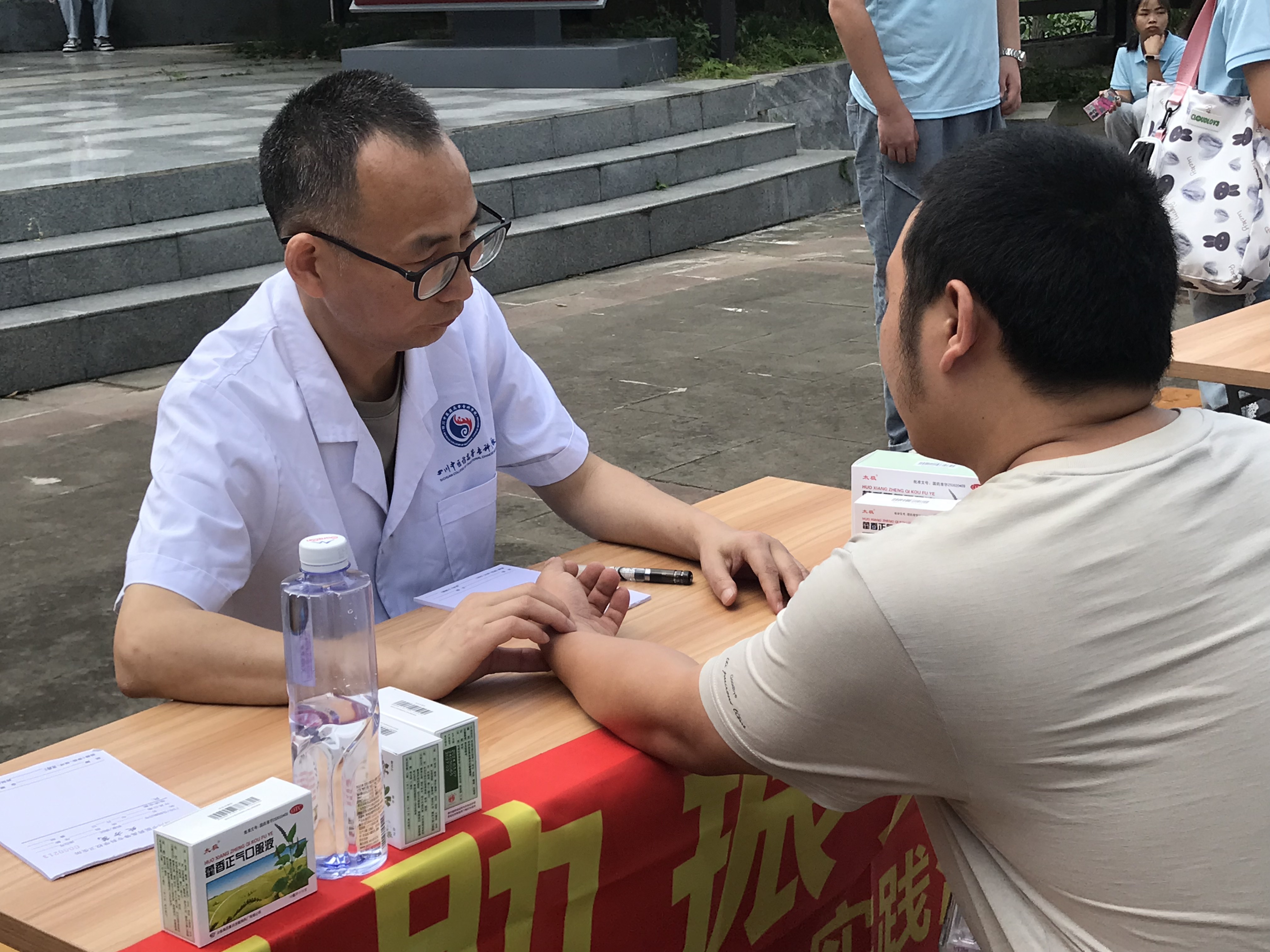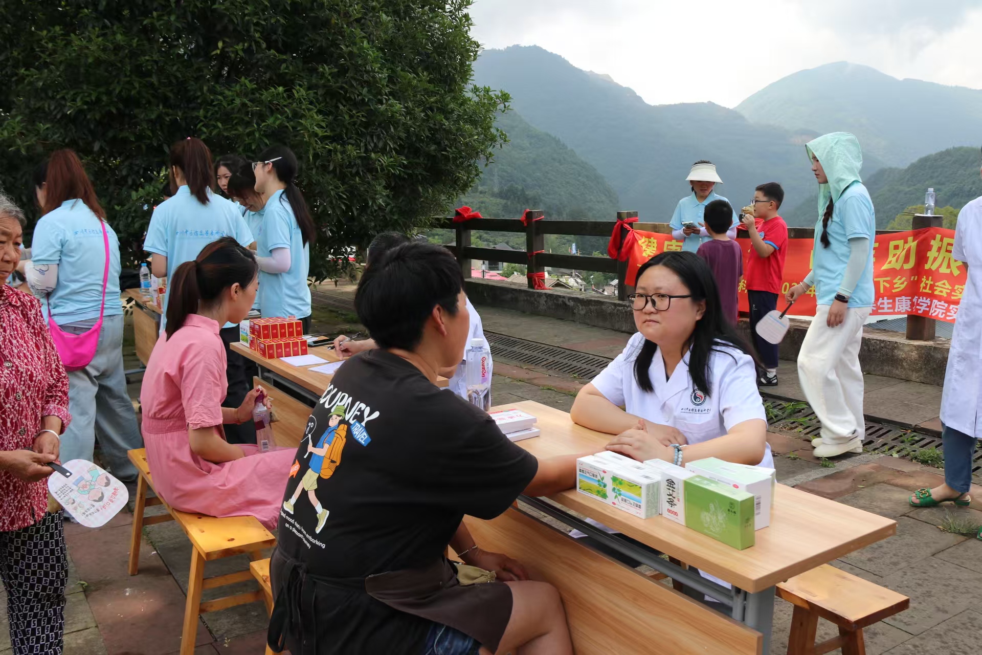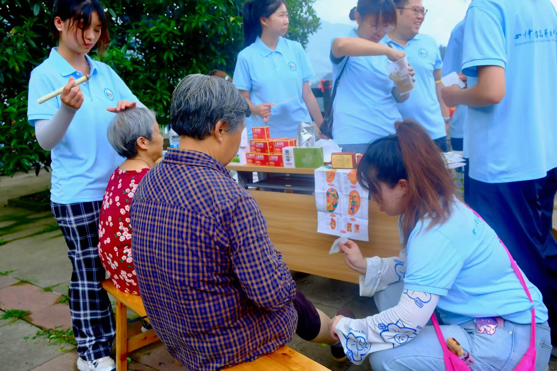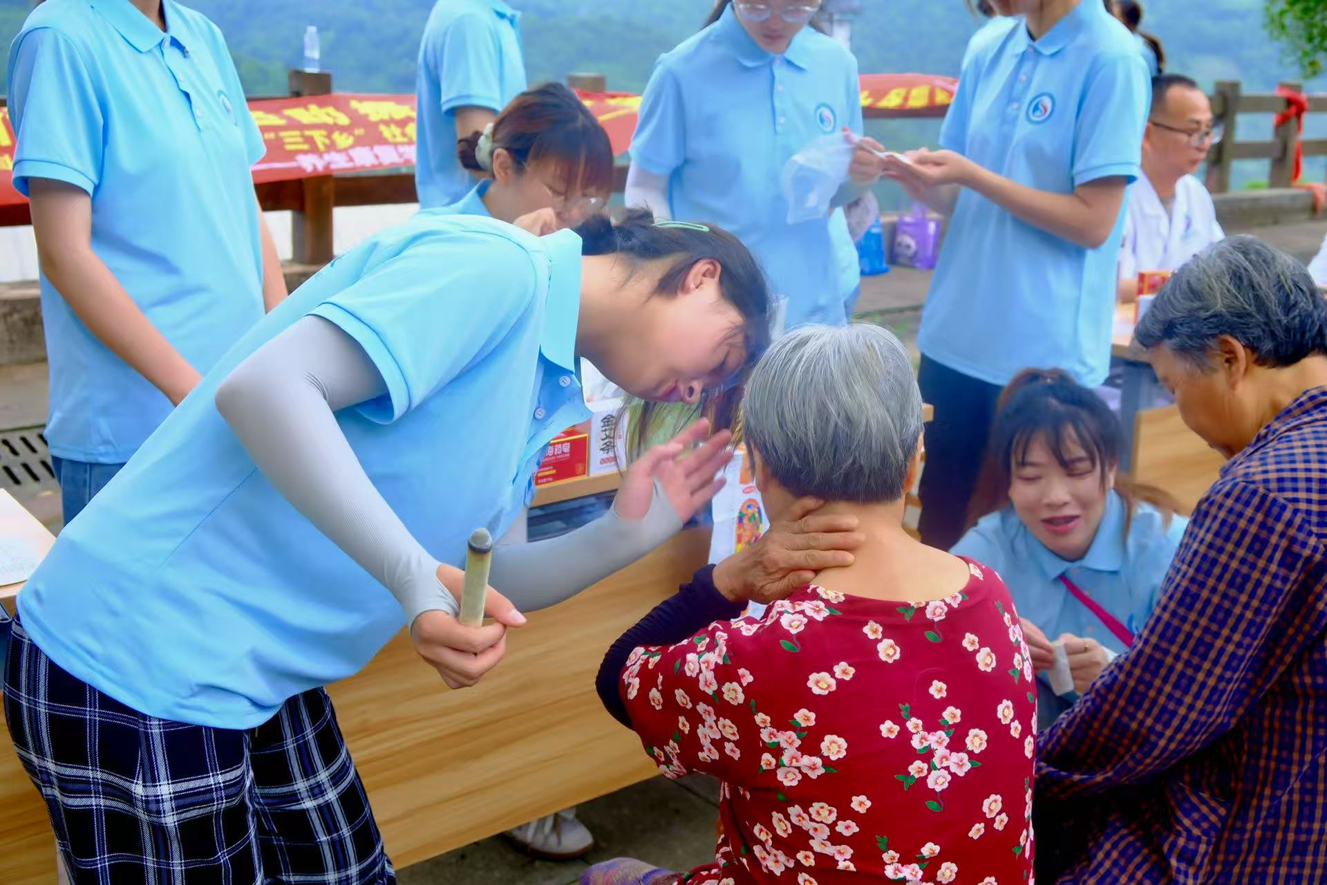 实践团队首站抵达在曲山镇石椅村,以丰富多元的实践内容将活动推向高潮。团队利用专业优势,为当地村民举办中医养生讲座,宣讲中医保健知识,教授八段锦、太极拳等传统养生功法,现场气氛热烈。针对村民常见的腰腿疼痛、关节不适等病症,成员们运用三伏贴、耳穴、中医健康咨询、推拿等中医适宜技术进行治疗,获得村民的一致好评。“这些年轻人手法娴熟,认真又贴心,经过推拿治疗后,我的老腰舒适多了!”一位村民满意地说道。