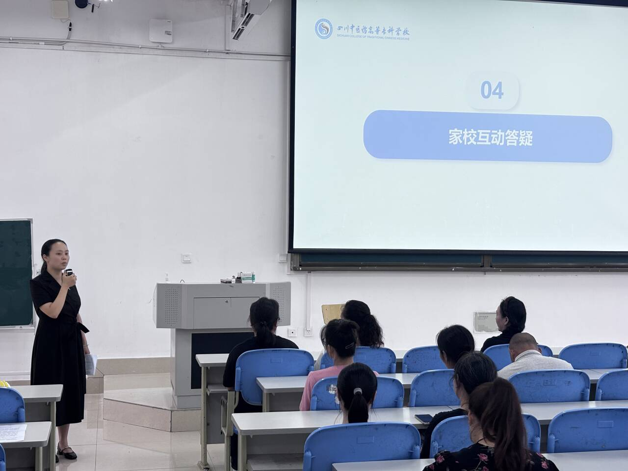 学院领导、专业负责人及新生辅导员与到场家长进行了深入交流。副书记夏艳代表学院致欢迎辞,向各位家长表示热烈祝贺与诚挚感谢,并简要介绍了我校深厚的办学历史、雄厚的师资力量、卓越的人才培养成果以及“厚德怀仁,博学笃行”的育人理念。她强调,中医学是中华民族的伟大瑰宝,培养优秀中医药人才离不开学院与家庭的携手努力,因此重点围绕 “共同关注学生心理状态、合力聚焦职业发展、携手重视学业与技能” 三大方面展开深入交流,进一步阐述家校协作的具体方向,最后希望家校同心同德,为学生营造潜心问道、精研医术的良好成长环境。