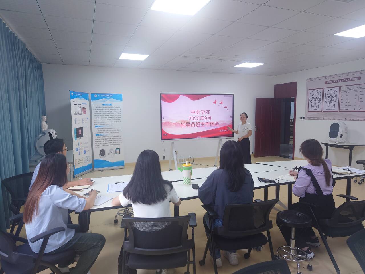 9月26日,中医学院于附子楼3楼舌面诊实训室召开了9月辅导员工作例会。学院党总支书记姜涛、副书记夏艳、组织员胡倩、学生科科长高洁、党委学工部专职心理教师黄依伦以及全体专兼职辅导员、班主任均出席了本次会议。