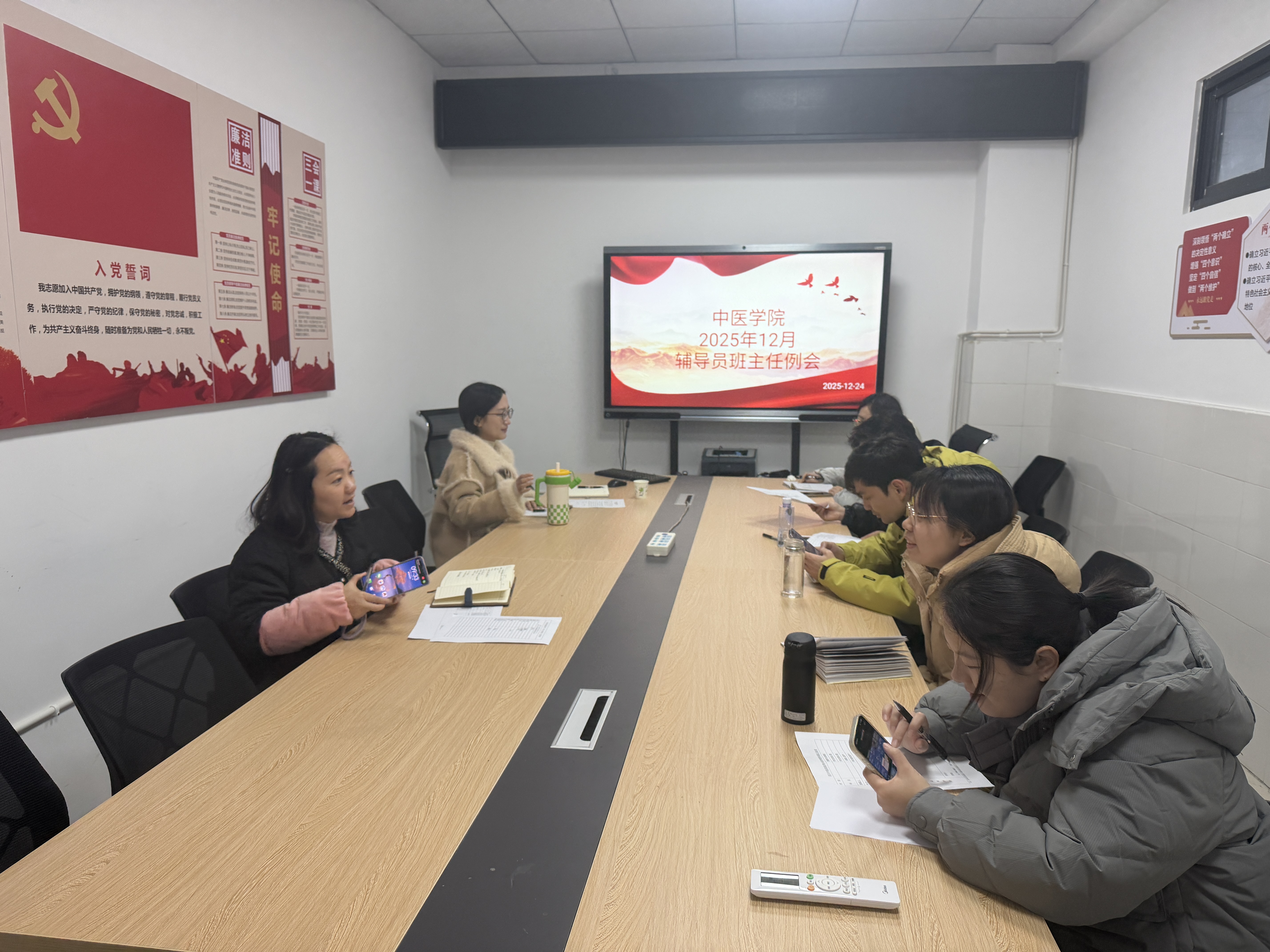 为深入贯彻落实相关会议精神,精准掌握学生思想动态与成长状况,切实提升学生管理服务工作质效,12月24日,中医学院组织召开2025年12月辅导员班主任工作例会。党委学生工作部黄依伦老师、全体辅导员、班主任参会,会议围绕上级会议精神研读、重点学生研判及下一步工作安排三大核心议题展开,凝聚育人共识,部署重点任务。