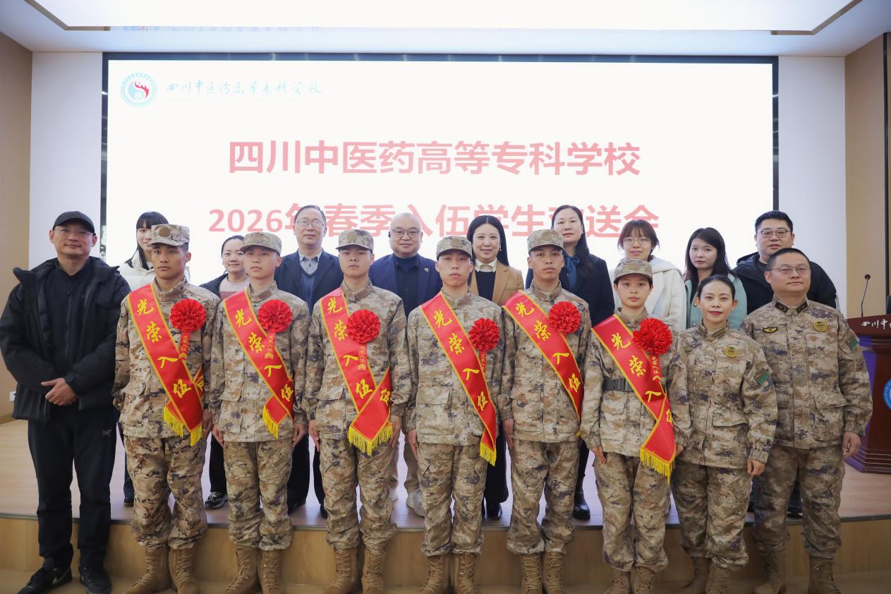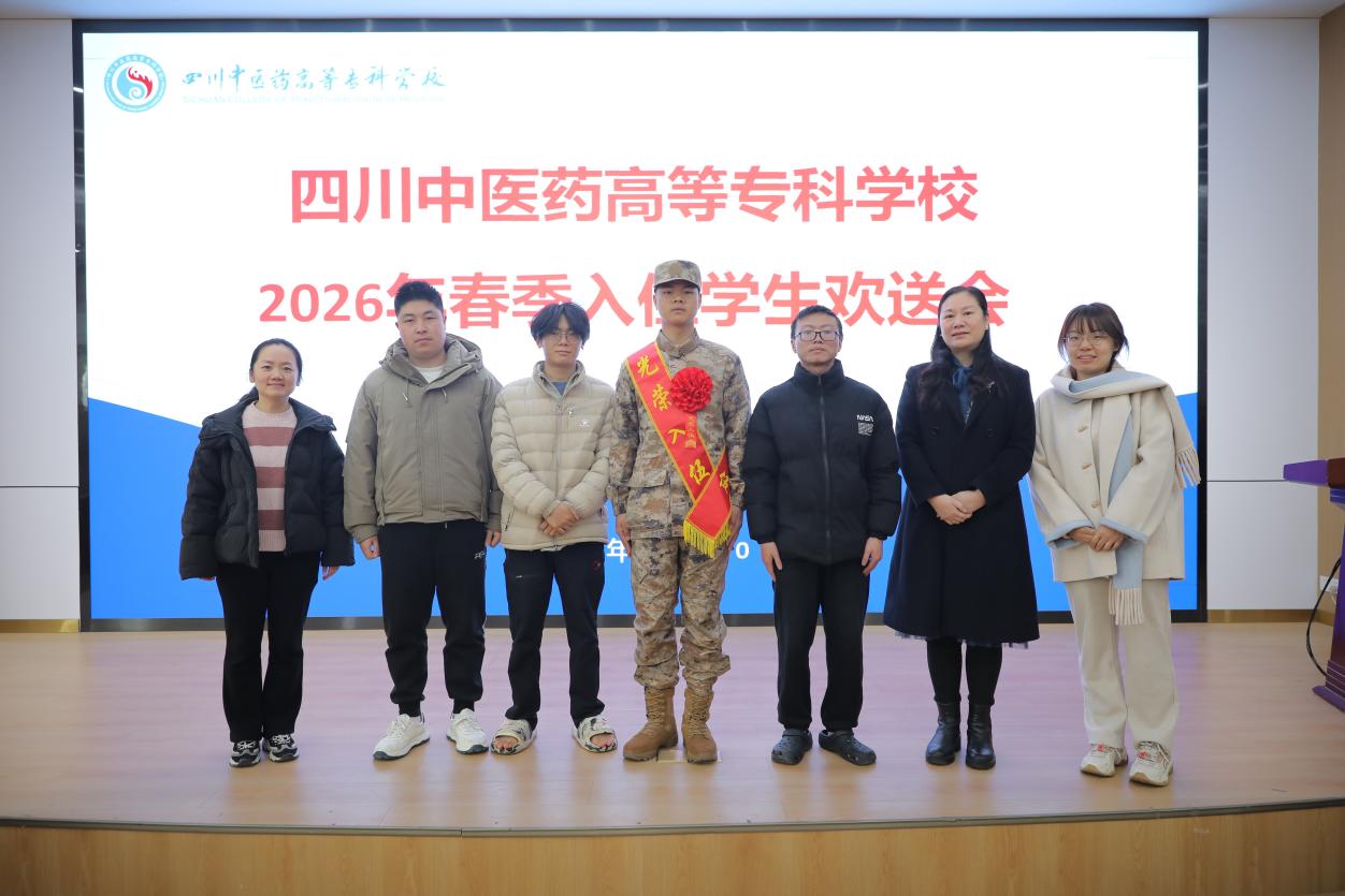 3月20日上午,我校2026年春季应征入伍学生欢送会在北区一教学术厅隆重举行。中医学院党总支书记姜涛、副书记夏艳、辅导员李若楠前往欢送会现场,为本院光荣入伍的郭智彬同学送行。另一名应征入伍学生王超,因海军潜艇兵种任务需要已提前出发,未能到场参加本次欢送会。